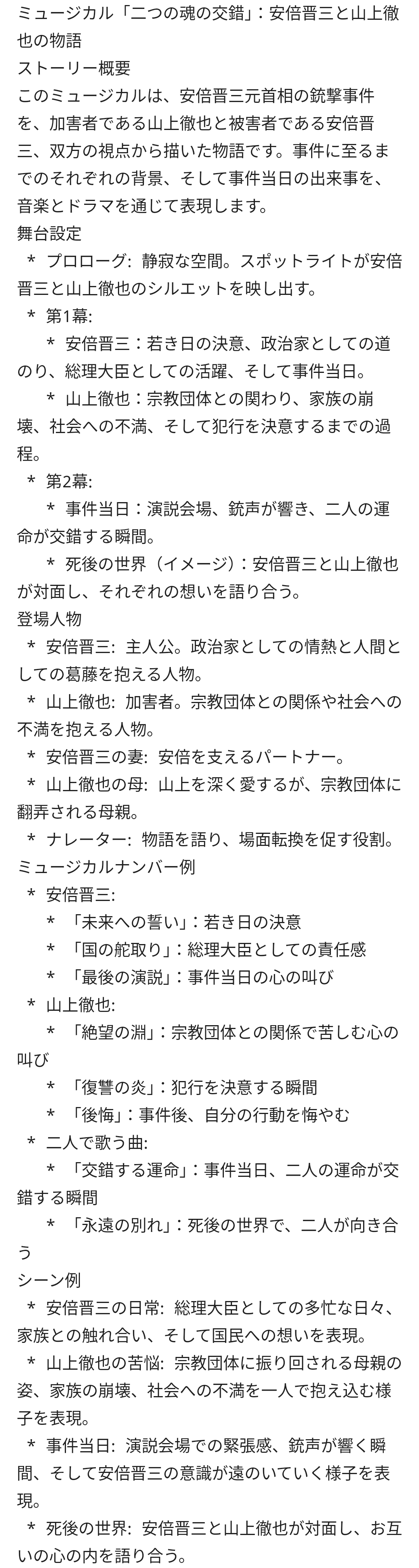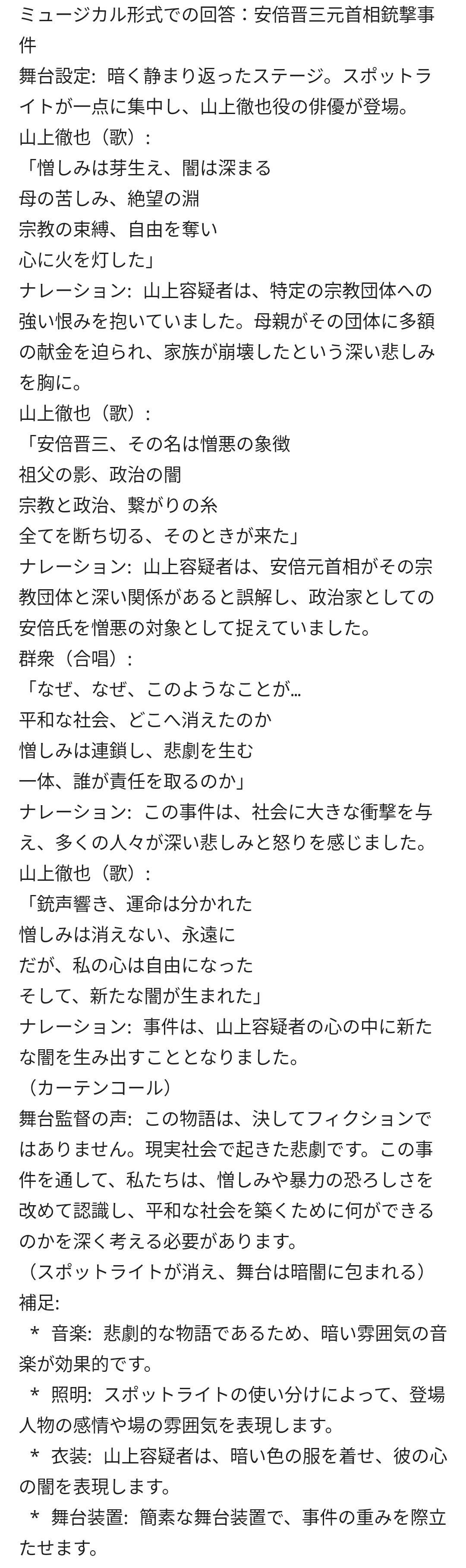 AIさん、ミュージカル「安倍晋三と山上徹也」の台本を書き上げてしまう…