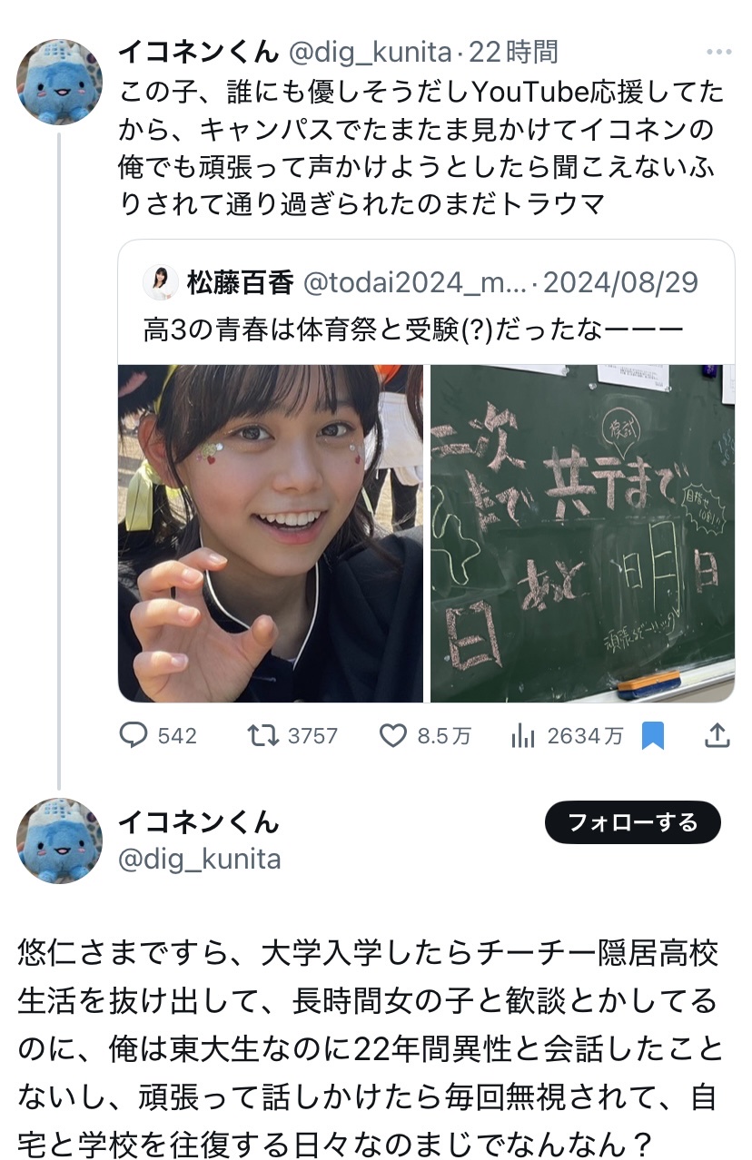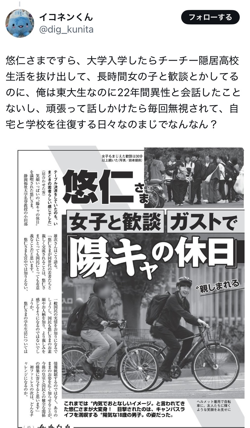 一時同じ空間(大学)にいるから同ポジ(大学生)だと錯覚してるようだが、悠仁様は将来天皇