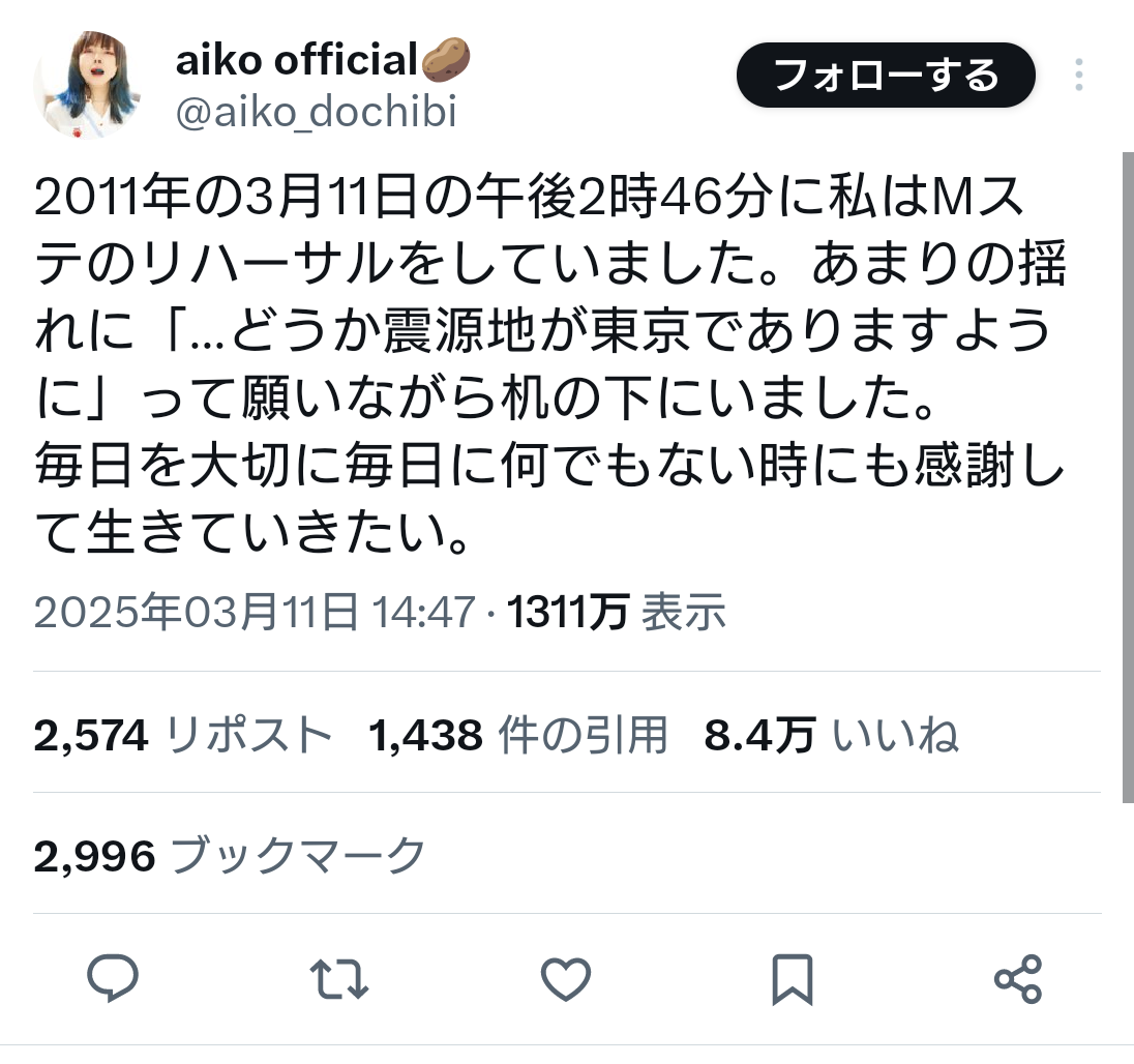 aiko、「震源地が東京だったら良かったのに」と呟き炎上