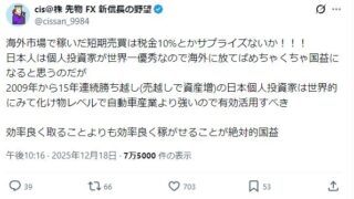 嫌儲 cis「海外短期売買の税率を10%程度に下げて世界で活躍させろ、日本個人投資家は世界的にみて化け物レベル、効率的で国益