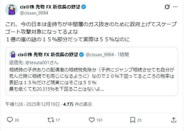 cis「今の日本は金持ちが中間層のガス抜きに政府上げてスケープゴート攻撃対象になってる、1億の崖15%部分も実際は55%