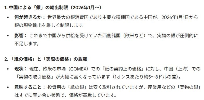 一言でいうと:「中国が銀を外に出さなくなるので、世界中で本物の銀が足りなくなる。今ついている安い価格(紙の市場価格)はウソで、これから本物の銀の価値がとんでもなく上がるぞ」という警告です。中国が#SILVER市場を破壊した🇨🇳 🚨