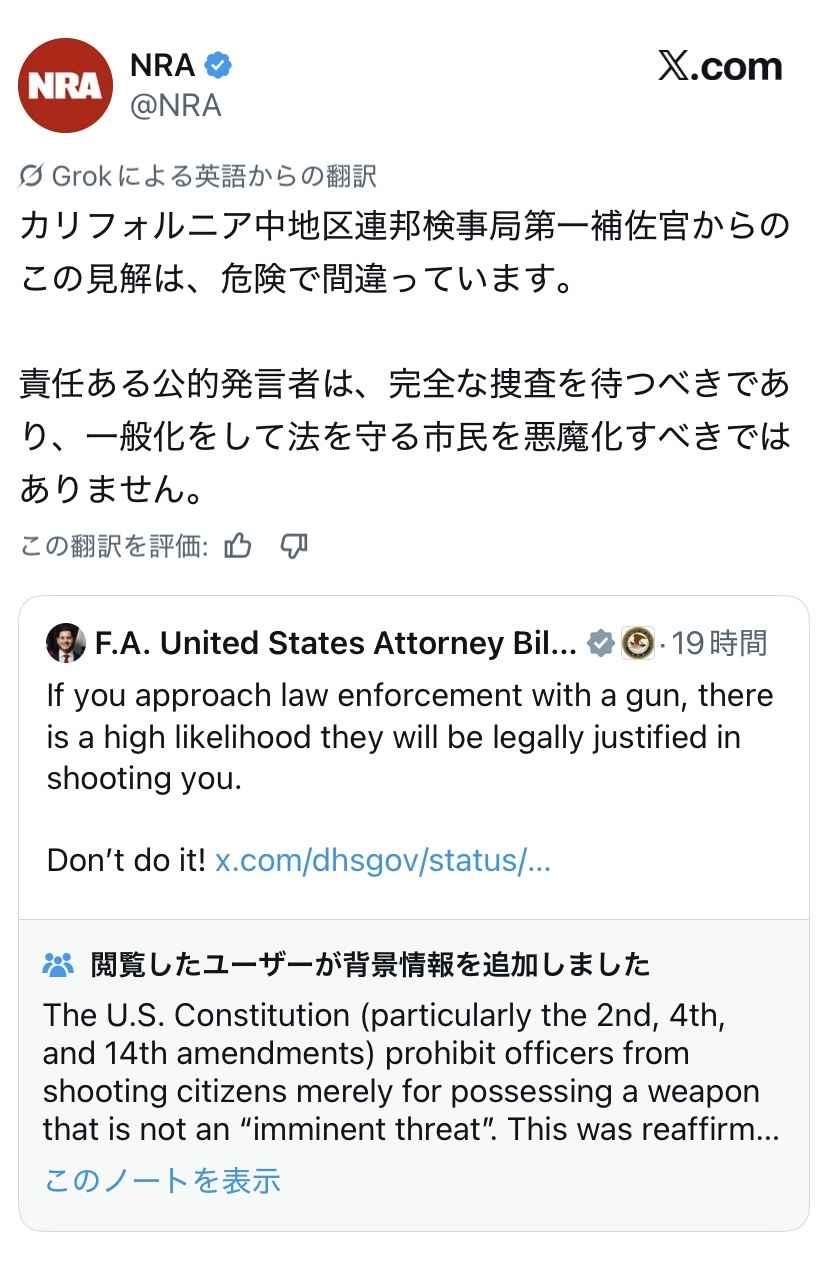 NRA slams federal prosecutor’s post about Minneapolis shooting: ‘Dangerous and wrong’A Border Patrol agent in Minneapolis shot and killed a man, ratcheting up tensions in a city already shaken by another fatal shooting weeks earlier.www.1011now.com🇺🇸 NRA、連邦検察官の発言を「危険で間違い」と批判 — ミネアポリス射殺事件めぐり