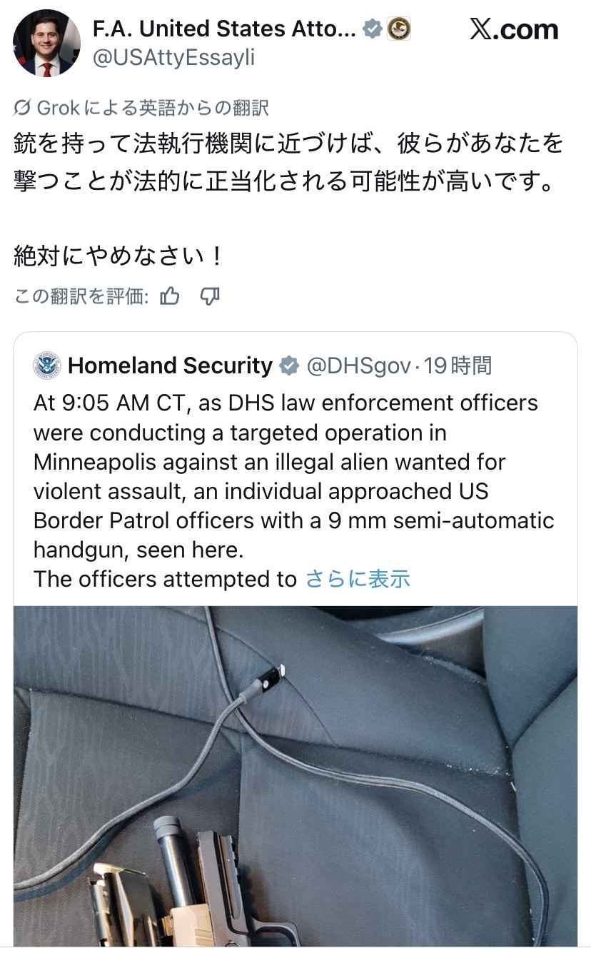 一方、ミネアポリスで射殺された37歳の男性アレックス・プレッティ氏については、現時点で法執行官に銃を向けたという確たる証拠はなく、現場の映像には武器を構えている様子は確認されていないと報じられている。プレッティ氏は合法的な銃所持者であり、地元警察はその点を認めているという。
