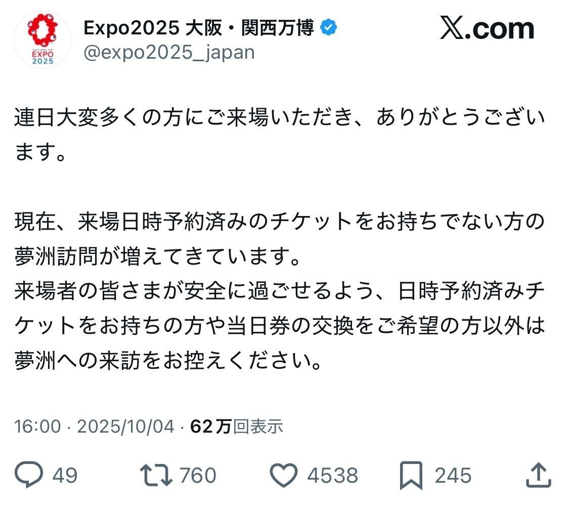 入場制限かけて来場者数減らしたのにチケ難民が会場に押し寄せるんじゃ意味ないからな - 18 : 2025/10/05(日) 08:04:14.13 ID:33LqBKrF0