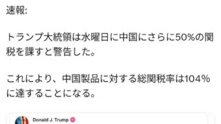 嫌儲 【相互関税】第2弾が今日発動、中国には計104パーセントの関税