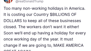 嫌儲 トランプ「アメリカは祝日が多すぎる💢休みなしで働いてMAGA!労働者も同じことを望んでる🐙」お、おやびん?