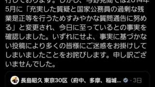 嫌儲 自民党長島昭久、事前通告騒動で謝罪 「事実誤認投稿のお詫び」