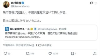 なんG 北村晴「高市が総理になり中国は泣いて悔しがってる。これが日本の国益」中国「高市さん総理就任おめ」