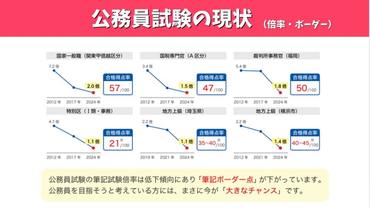 公務員試験の倍率は年々下がり、筆記のボーダーも低くなってきています‼
